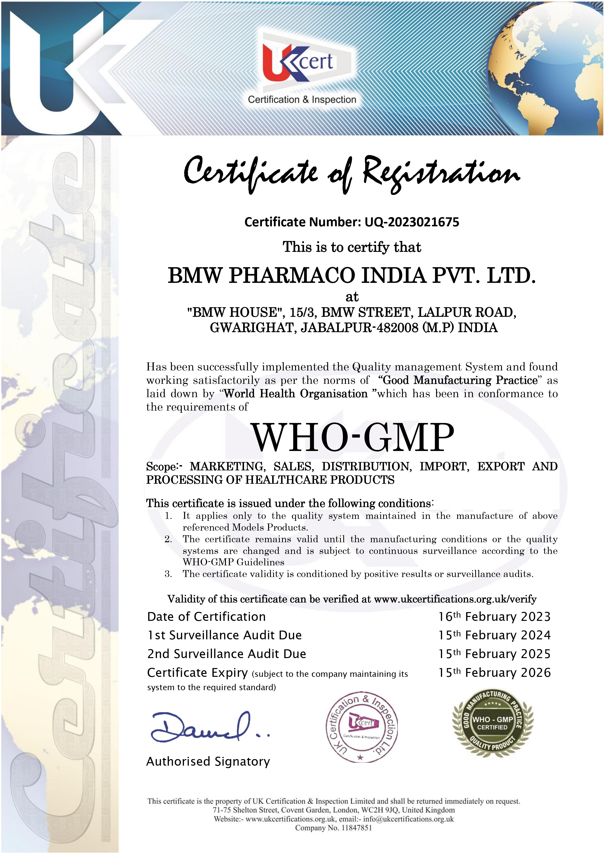 These certifications reinforce our credibility and demonstrate our unwavering commitment to providing safe, effective, and high-quality pharmaceutical solutions to healthcare professionals and patients. At BMW Pharmaco India Pvt. Ltd., we continuously strive for excellence by adhering to global regulatory standards and consistently raising the bar for quality and compliance.