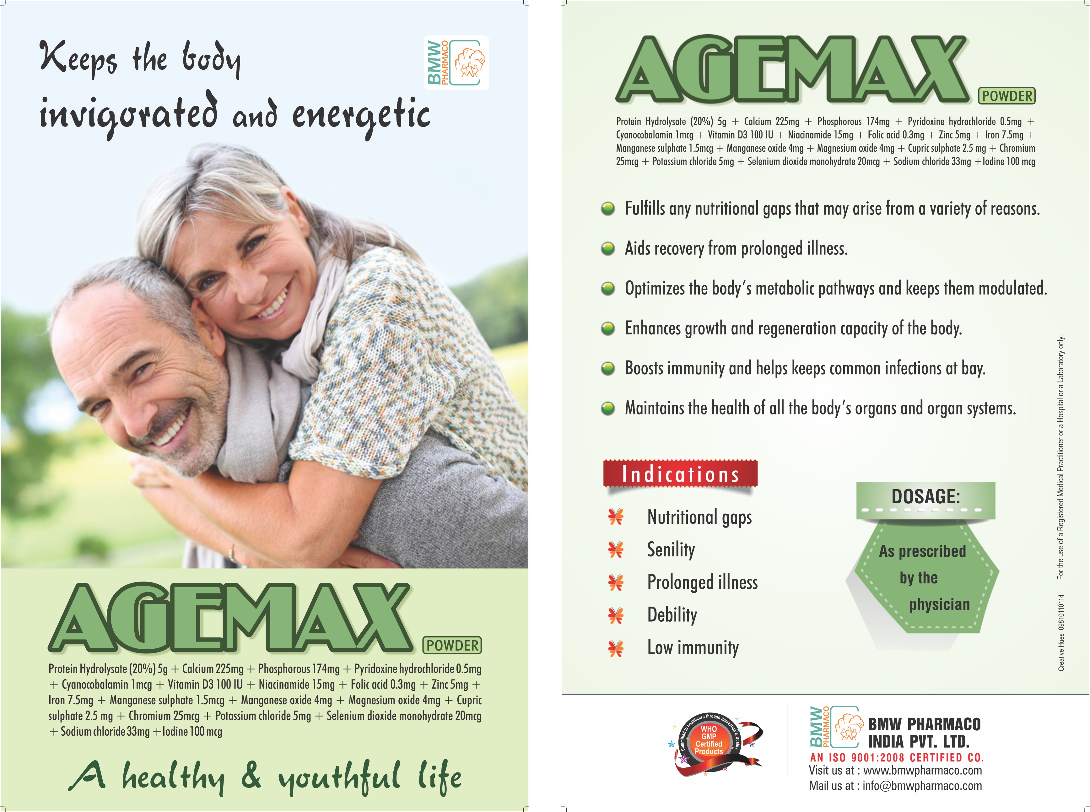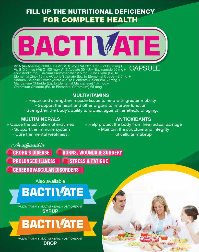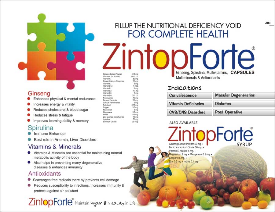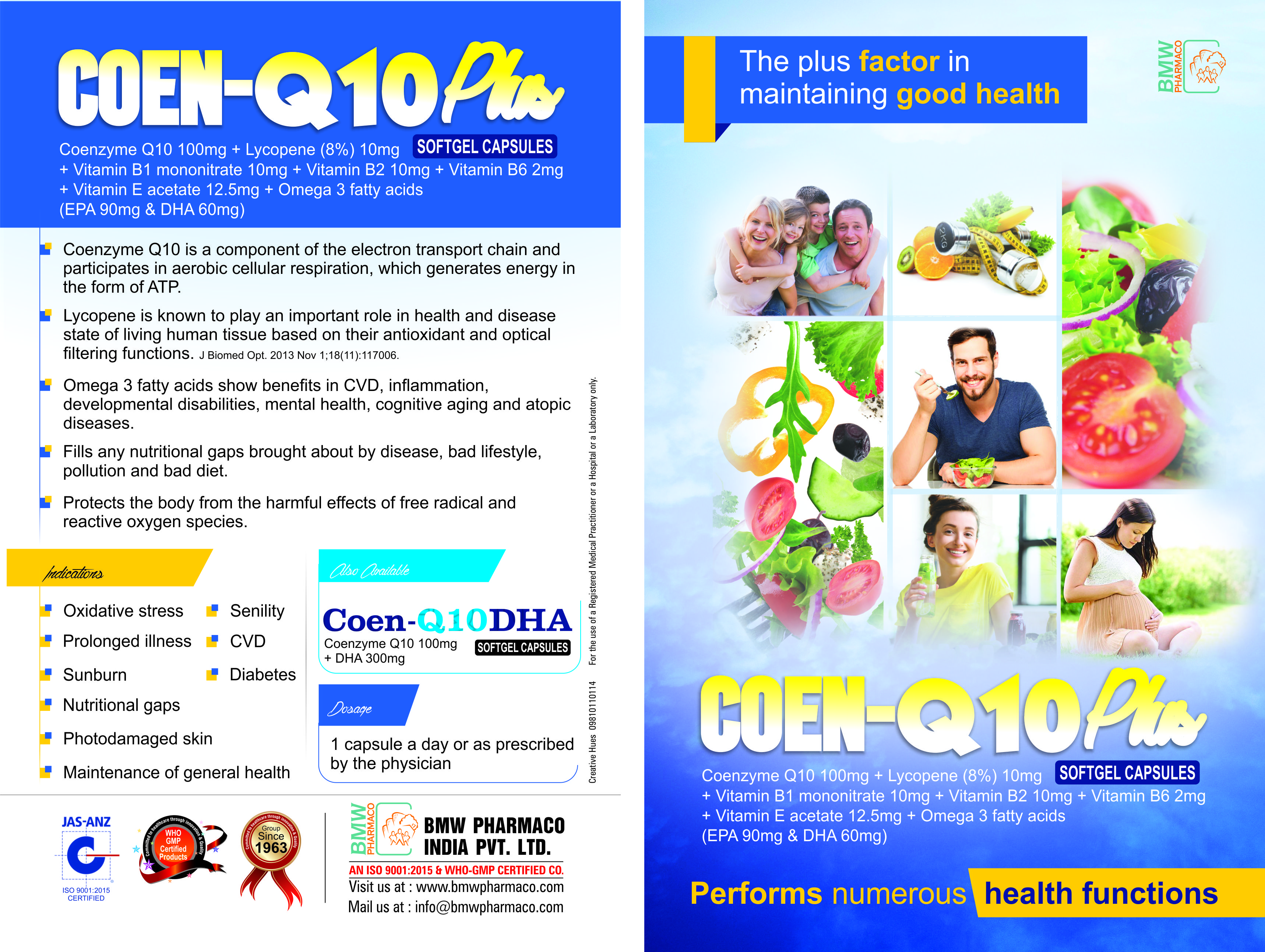 Omega-3 fatty acid providing Eicosapentaenoic Acid (EPA) 90 mg + Docosahexaenoic Acid (DHA) 60 mg + Green tea extract eq. to polyphenols10 mg + Ginseng extract 42.5 mg + Ginkgo biloba extract 10 mg + Grape seed extract 15 mg + Ginger extract 10 mg + Garlic extract 10 mg + Guggul 10 mg + Green coffee Bean extract 10 mg + Glycyrrhiza glabra extract 10 mg + Gulab extract 10 mg + Giloya extract 10 mg + Green chirata extract 10 mg + Lactic Acid Bacillus 500 Lacs spores + Citrus Bioflavonoids 20 mg (8mg of Bioflavonoids) + Natural Mixed Carotenoids (10%) 11.33 mg +Vitamin D3 200 IU + Wheat Germ Oil 25 mg + Menadione sodium Bisulphate (Vitamin K) 10 mcg + Benfotiamine 1.5 mg + Vitamin B6 1 mg + Vitamin B12 1 mcg + Niacinamide 20 mg + Calcium Ascorbate 45 mg + Folic Acid 150 mcg + Biotin 100 mcg + Choline Bitartrate 25 mg + Lutein 250 mcg + Piperine 5 mg + Diabasic calcium phosphate eq. to elemental calcium 20 mg + elemental phosphorus 15.45 mg + Ferrous Fumarate 30 mg + Zinc oxide eq. to elemental Zinc 15 mg + Potassium Iodide eq. to elemental Iodine 150 mcg + Magnesium oxide eq. to elemental Magnesium 30 mg + Manganese sulphate eq. elemental Manganese 1.5 mg + Copper sulphate Pentahydrate eq. to elemental Copper 0.5 mg + Chromium picolinate eq. to Elemental Chromium 65 mcg + Sodium Molybdate Dihydrate eq. to elemental Molybdenum 25 mcg + Potassium Chloride eq. to elemental Chlorine 4 mg + elemental Potassium 3.6 mg + Sodium borate eq. to elemental Boron 150 mcg + Nickel sulphate eq. to elemental Nickel 5 mcg. (SOFT GEL) |