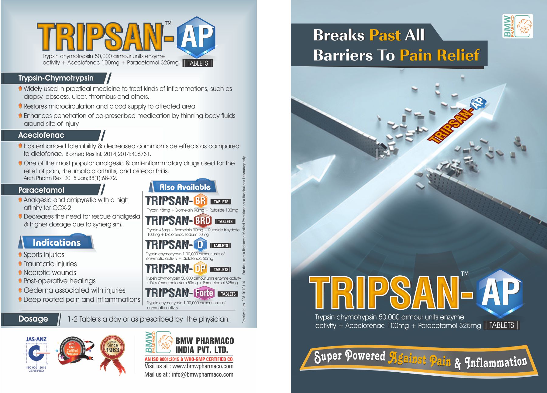 Trypsin Chymotrypsin 15,000 Armour Units +Aceclofenac 100 mg + Paracetamol 325 mg |